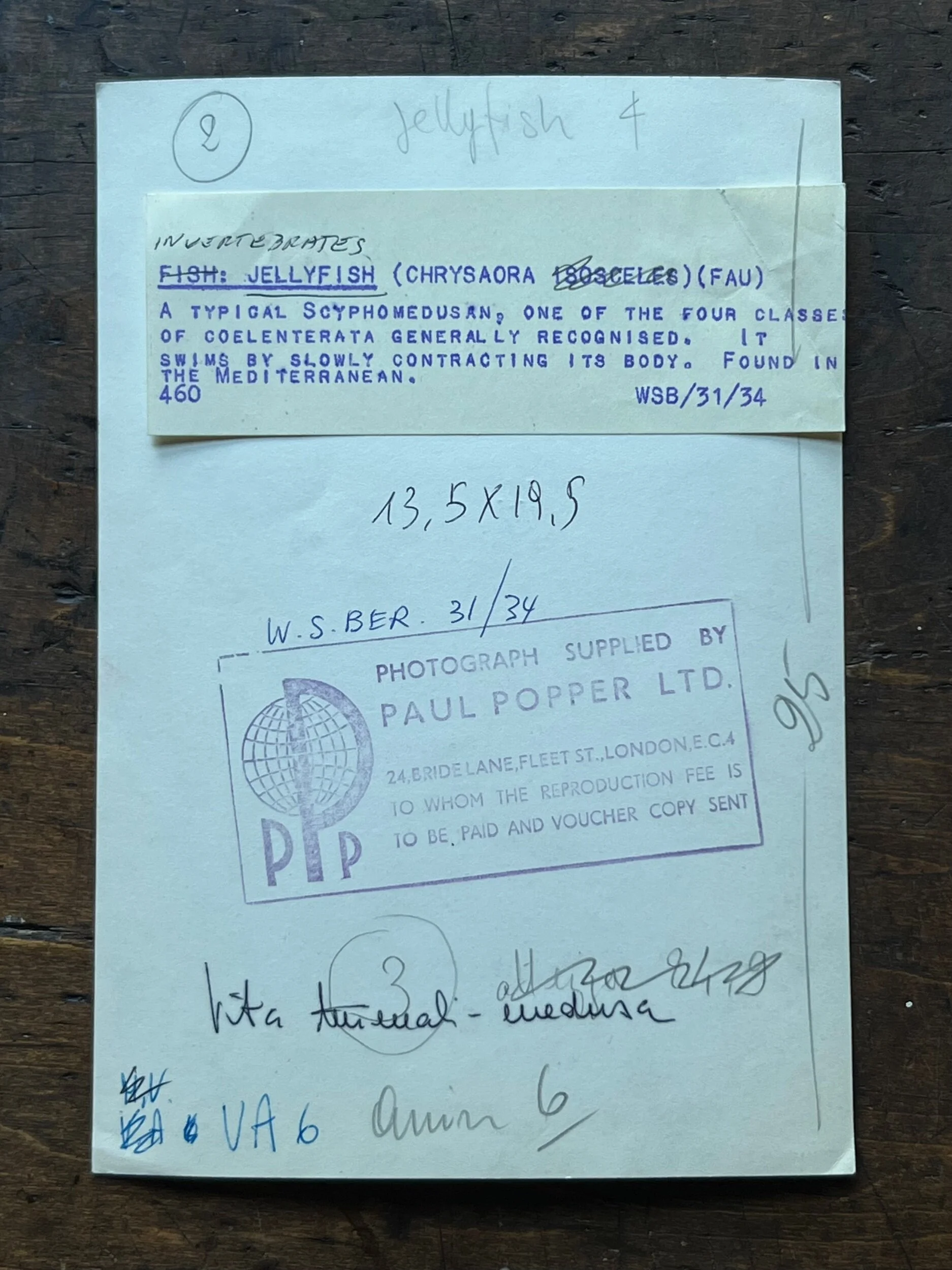 Jellyfish (Scyphozoa), by Paul Popper, silver-gelatin photograph, 5 inches x 7 1/2 inches, floated in 9 inch x 12 inch high-quality wood frame, c. 1940's-1950's, condition- Very Good
